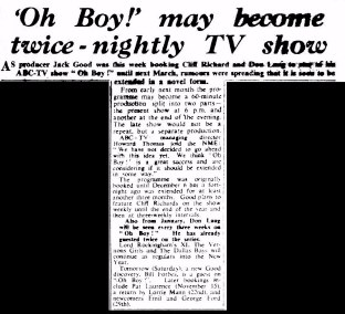 ABC-TV managing director Howard Thomas told the NME: "We have not decided to go ahead with this idea yet. We think "Oh Boy!" is a great success and are considering if it should be extended in some way."