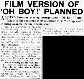 Talks are currently in progress for the making of an "Oh Boy!" film at the ABC studios in Elstree. It would be a full-length feature film, probably with a story-line, as was the film version of "6.5 Special" which proved a big box-office attraction.