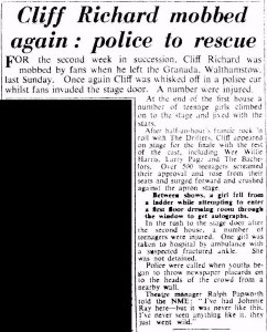 For the second week in succession, Cliff Richard was mobbed by fans when he left the Granada, Walthamstow, last Sunday Once again Cliff was whisked off in a police car whilst fans invaded the stage door. A number were injured.