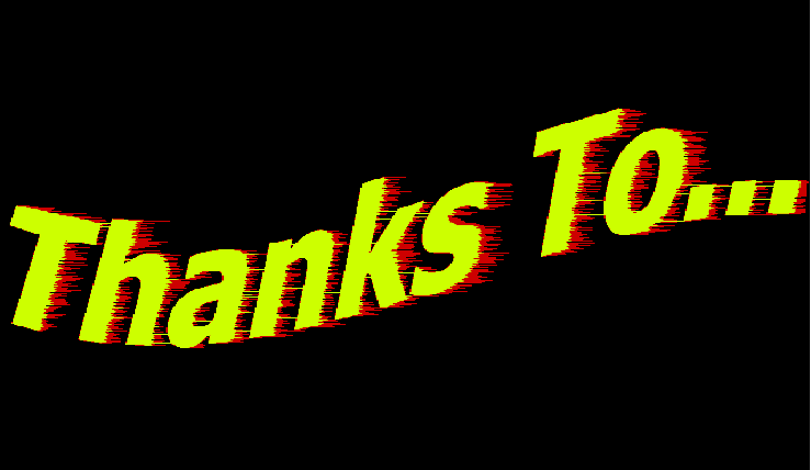 . Stephen Stacy for being my scapegoat and letting me take my problems out on him Narbosa for having a cool site TPWW Keith Smith for the world cup page Karma, da rekmon, and trev for joining my webring Rob Stevens for his Shocking farts This is an apology for having a Go at Da madman when he had a worm virus SORRY. Keely + Nici For signing my guestbook CHEERS |