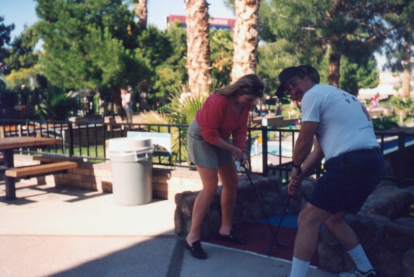 On the way to Tim's, we stopped off at a place that had miniature golf and Roger and I sat in the shade (it was very hot outside) while Tess and Tim played a round (of golf that is..lol). While we were sitting outside practically dying from the heat, I decided to be a smart-ass and put an icecube from my icewater down Rogers shirt to cool him off. In the process, I managed to tip over my very large glass of ice water so that it poured all down my legs.....hmmmmm.... who was laughing now?? Actually, it was great.... it cooled me off!!