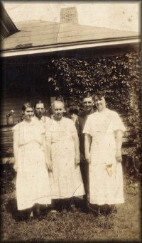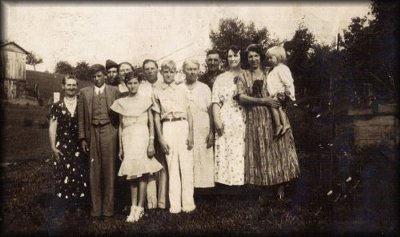 At the end on the left is Fannie Rose Bell Cress. At the end on the right is Leona Elizabeth Cress holding Janett Marie Porter, to the left of her is Celia Evelyn Cress, (possibly) Robert Seymore Cress, Sarah (Indy) Cynthia India Cress, Unknown, Charles Muncey Cress, and the others are unknown at this time also. Recently I found out that the young girl in the white dress standing in front is Mary Kay Cress, Fannie's daughter.