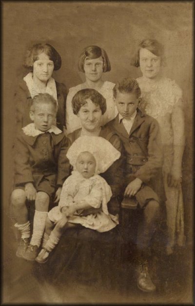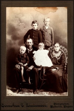 Fannie Rose Bell Cress with her children. The boy sitting to the left of Fannie is Alexander and the boy on the right is Paul. Mary Kay is sitting in Fannie's lap. The three girls behind Fannie are Mattie Bell, Lottie, and ?. We are not sure which is which though.