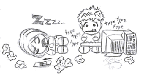 In other breathtaking news… I’m drawing, as fast and as skillful as I possibly can. (It’s hard to be fast, and skillful… so they kind of balance each other out) It is hard work. I’ve been letting myself stay up till 10 and that’s it. Otherwise, I’ll burn out way too fast. (On Saturday, however, I can stay up till 2 or 3… Unless I have an English paper due *sigh*) I’ve learned a lot from this senior project… Wait; let me emphasize this a little… I HAVE LEARNED A LOT FROM MY SENIOR PROJECT. I really have! I have come to realize that it takes a whole lot of time to make ONE single comic. I mean, listen to the process:
