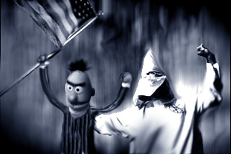 is Evil ! It has long been rumored that Bert was part of the Ku Klux Klan. Latest evidence show that he IS part of the Klan, but more surprisingly, some evidence points to the possibility that he is a founding member. The Klan's pointed cowl was actually patterned after Bert's head. In these photographs, Bert is seen at the burning of the crosses ritual. |