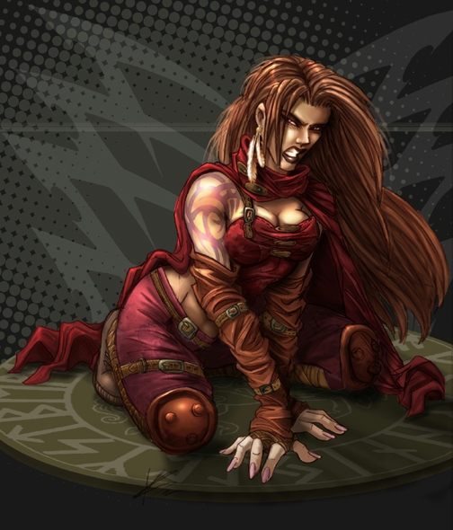 Syndra is a small and petite female sylvan elf. Her long red hair and blue eyes has marked her as good fortune for her clan. She dresses in colored studded leather and is never seen without her bow. Syndra has ritual tattoos on her wrists, ankles and neck, in honor of her religion, Solonar Thelandira. The artwork depicts arrows with ribbon work of leaves and branches.