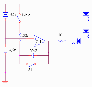 Este circuito incrementa la intensidad de iluminación de los LEDs conforme se va cargando el condensador, para realizar nuevamente el proceso descargue el condensador por medio de S1.