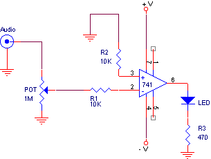 El led encenderá o parpadeará según la presencia de señales de audio en su entrada, aunque sean de poca intensidad. La fuente debe ser simétrica, con tensiones entre 5 y 15 v. El resistor en serie con el led de 470 ohm para tensiones entre 5 y 9 v. y de 1K para tensiones de 9 a 15v.