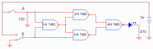El LED encenderá cuando ambas entradas A y B sean diferentes, si ambas son iguales tanto si tienen un nivel lógico alto como bajo, el LED no encenderá, es decir la salida esta en un nivel bajo.