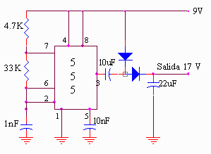 El circuito duplica el voltaje de alimentación, en este caso con 9V de entrada la salida es 17V, sin carga y con una carga de2,2k el voltaje es de 15V.
