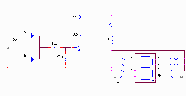 En este caso la salida sera alta si alguna de las entradas A o B este en alto(+) logica positiva y el diplay mostrara una H, esto es asi pues si alguna entrada tiene un voltaje + polarizara directamente al transistor, de entrada y este a su vez polaarizara al de control.