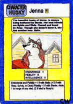 Just kidding! These are some nifty cards that I made up just to amuse myself! Currently there are only (as I stated) eight finished cards in existence, but I have at least 20 cards made up on my computer. All they need is to be printed, coloured, and have an image put on them. I managed to find pictures that were small enough for me to trace into the tiny space provided. I'm looking for more pix so that I can finish more of the cards. Anyway, here are four that I have scanned; the other three will be on the Balto Fan Art Website. I mailed my Balto card to the magazine SCRYE for their dream cards section but they didn't use it and I didn't get it back!