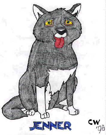 This is a picture of Balto's son. He is approximately 3 or 4 months old in this picture; he's 9 months old in the story. Jenner was born after Kala (about 5 minutes and 34 seconds after). I drew this picture from a picture that I got off the Internet of the REAL Balto. He was all black with white paws and stomach and brown around his eyes (as seen on the picture of Jenner). He has the wolf-like features of his father (he still has wolfy yellow eyes with green iris'). They (Balto and Jenna) agreed on Jenner because the name sounded like (and is probably the male equivalent to) Jenna.
