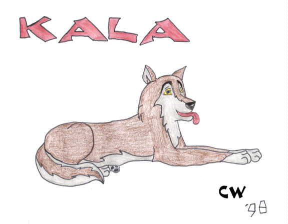Balto's other pride and joy, Kala. She has traits from both parents. Probably her most distinctive feature is that she looks like her mother. She has grey on her face and stomach from her father as well as the yellow, wolf-like eyes, but they are unusually blue while her parents are green (Balto) and fiery orange (Jenna). She is nearly grown up in this picture; she is 9 months in my Balto story.