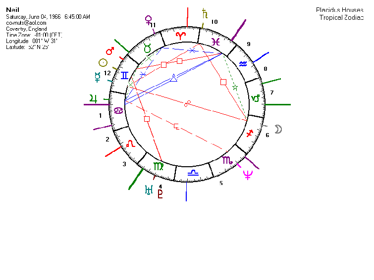 ![]() Neil has a Gemini sun and a Sagitarius moon. Fire and Air, he is a Mr Man type guy. His Cancer ascendant may give him a different apperance, of a nice type guy but under this mask Neil means bussisness. Maybe however with Mars in Gemini and almost all alone in the chart, Neil has some diffucilty directing his energy. Like all Gemini's he has to many irons in the fire, and a lack of direction. All the inteligence in the world is useless without direction and Neil is just floundring. He should look to his Venus in Taurs for some help. Maybe Neil would make a great artist or collector, where he can seemingly scamper around and still be effective. Neil should be a party guy and probably likes his beer and friends. I would say Neil like to sit in the kitchen with a few pals, drink beer and swap stories.