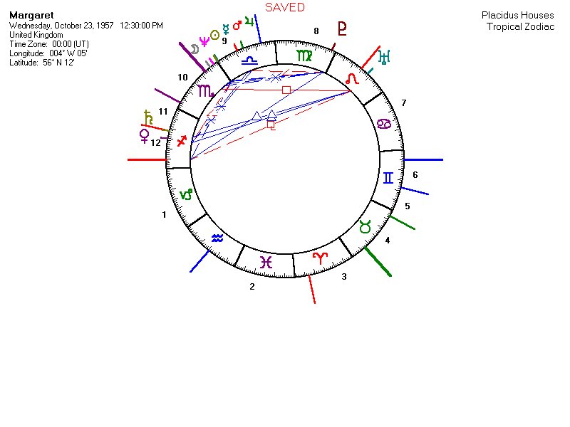 ![]() Hmmm, Margaret has got to be someone very interesting. She has some conjunctions and stelliums. I am not sure of the birth time so I have to make a limited reading. Anyway Margaret is a very determined and hard driving lady. She has great self-dicipline and a mathmetical mind. Kind of a Miss Spock. Logical self willed and hard driving. She also should have a musical talent with the moon, neptune, sun configuration. Maybe Margaret teaches music in a prep school, a military prep school. If she did, she would be one tough cookie.