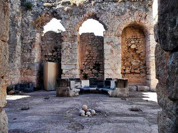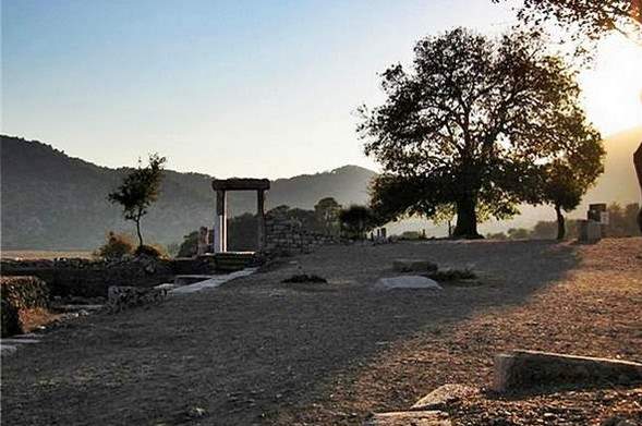 | The apse to be seen lying to the southeast of this building, belonged to a three-naved church which was built in the 5th or 6th century AD. The temple consists of a front space (Pronaos) containing two Doric columns between its side walls and an approximately square sacred room (Cella). The courtyard of the temple, which measures 30.50x35.00 m. was enclosed by a colonnaded gallery built of sandstone. This was originally coated with plaster and painted. According to the inscription on the cylindrical column drum at the western end of the Courtyard (Temenos), the temple was dedicated to Zeus Soteros.