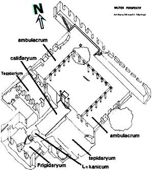 The bath building, which measures 58.20x28.20 m, consists of large halls. The two warm halls (Tepidarium) and the two exercise halls (Ambulacrum) were on either side of the hot room (Caldarium) and the sweating room (Laconicum) which form the middle axis. All these rooms are crowned by the cold room (Frigidarium) to the southwest. Each of these halls were originally paved with thin marble slabs. In the Byzantine period, the baths were dismantled and the frigidarium was re-used as a church. The sections of undressing, cold bath, warm bath, hot bath, oiling, heating system and a swimming pool, which became ruins over time, are now being restored. |