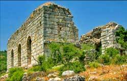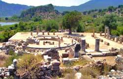| CITY RAMPARTS : Apart from the ramparts that surround Acropol, there are also ramparts surrounding the city. The ramparts extend through Balyklar Mountain in the south and southeast, through the smaal fortres in the north and northwest, through Çömlekçi Hill in the west and through the region that overlooks the town of Dalyan in the south. The city walls were erected during the reign of Mausolos in the 4th century BC but restored in different periods. The height of the ramparts is a few meters at some points. The remnants of the doors inside the ramparts are visible. The regularly-shaped rectangular blocks and the way the blocks |
