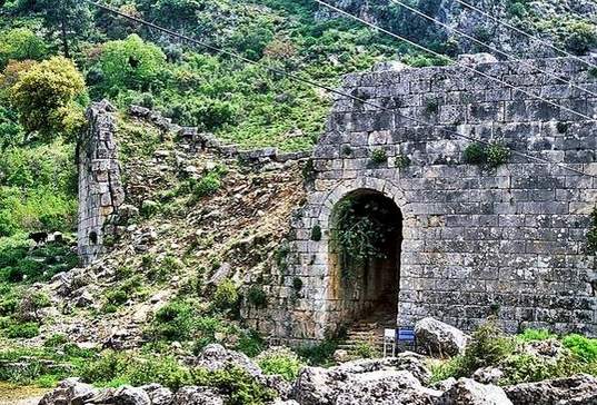 The Fountain of Theatre : The Theatre Fountain of Caunos takes place within the tail of analemma wall of the theater. It is a construction of a monumental fountain of 10.60 x 6m, built here in the interior of a large niche (11.80 x 3.15) with a single arc. For the construction of the structure used columns and marble blocks of lilac. The structure with two columns located between the two side walls, in-antis plan, was put in the form of a niche in the wall of the theater. This wall continues from above the building with three large arches.At that time, used to human trafficking to the upper terrace of the city; An estimate can be made, for now, only on the date of construction of the fountain: Late Classic Period (400-300 BC). |
