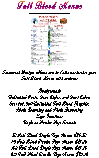 Immortal Designs allows you to fully customize your Full Bleed Menus with options: Backgrounds, Unlimited Fonts, Text Styles, and Text Colors, Over 101,000 Unlimited Full Bleed Graphics, Photo Scanning and Photo Rendering, Logo Creations, 1/2 Page or Full Page Formats. 50 Full Bleed Single Page Menus $26.50 50 Full Bleed Double Page Menus $47.70 100 Full Bleed Single Page Menus $47.70 1000 Full Bleed Double Page Menus $90.10 | ||||||||||||||||