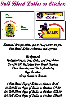 Immortal Designs allows you to fully customize your Full Bleed Lables or Stickers with options: Backgrounds, Unlimited Fonts, Text Styles, and Text Colors, Over 101,000 Unlimited Full Bleed Graphics, Photo Scanning and Photo Rendering, Logo Creations, Avery Standard Formats. 1 Full Bleed Lables or Stickers $1.86 50 Full Bleed Transparencies $79.50 100 Full Bleed Lables or Stickers $132.50 500 Full Bleed Lables or Stickers $530.00 | ||||||||||||||||