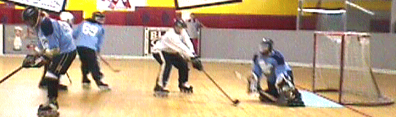 He shoots --- he doesn't score -- yet. That's it -- the final game of the Winter '99 regular season. The Mad Cows were 8 to 1 winners over the Bad Boys.