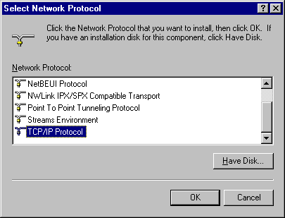 - Highlight the TCP/IP protocol, then click OK and follow the instructions.