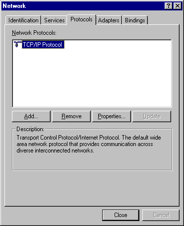 - If you have the TCP/IP protocol listed like above proceed to step 6. Otherwise click on add and you will see the following screen
