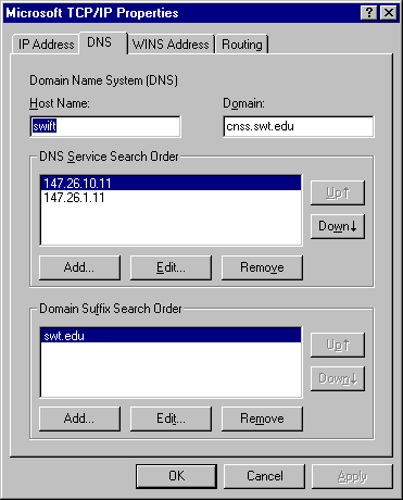 - Enter the first part of YOUR IP name under Host Name and the rest of your IP name under Domain. (Example: I am swift.cnss.swt.edu so I use SWIFT as the host name and CNSS.SWT.EDU as the domain. Then click on add in the DNS service search order box and enter 147.26.10.11, then click add again. Now click add again and enter 147.26.1.11, then click add again. Next click on the add button in Domain Suffix Search Order box and enter swt.edu then clcik add again. Finally click on the WINS button and you will see a screen like
