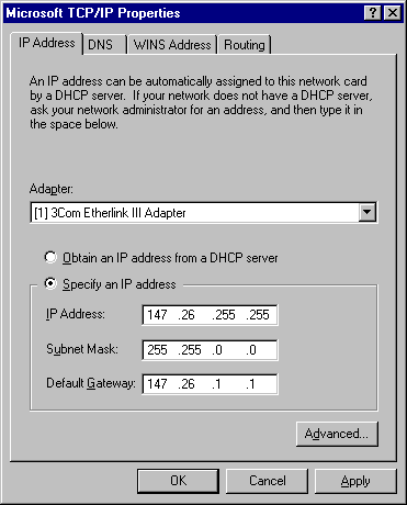 - Check the "Specify an IP address" radial button, and enter YOUR IP address that was assigned by your LSM. Enter the subnet mask of 255.255.0.0 and default gateway 147.26.1.1. Now click on the DNS tab at the top and you will see the following screen