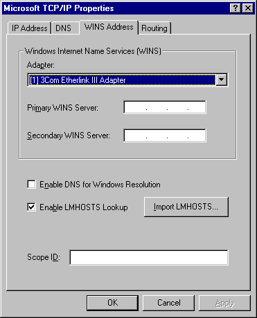 - No changes need to be made to this screen. Everything should be blank except for a check mark by Enable LMHOSTS Lookup. Click on the routing tab at the top and you will see
