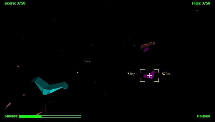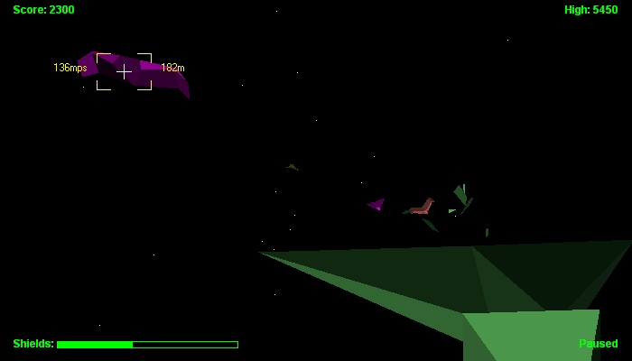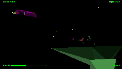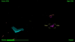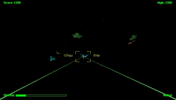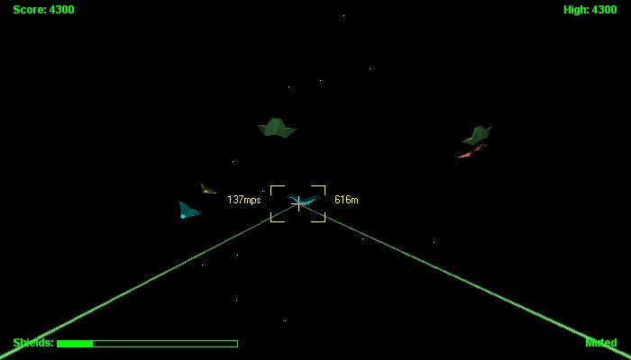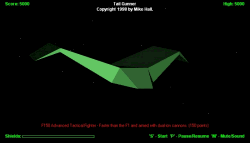 mouse or hit the 'S' key to start. Use your mouse to sight an approaching ship in your cross-hairs. A target box will light up when an enemy ship is in your sights, giving the craft's closing speed and range. Click the mouse button to fire. Whenever an enemy fighter gets past you, it will fire on your ship. You will see the screen flash and shake if they score a hit. Watch your shields - when they go, so do you. You can pause the game at any time by hitting the 'P' key. Hit again to resume. Use the 'M' key to toggle sound on and off. |