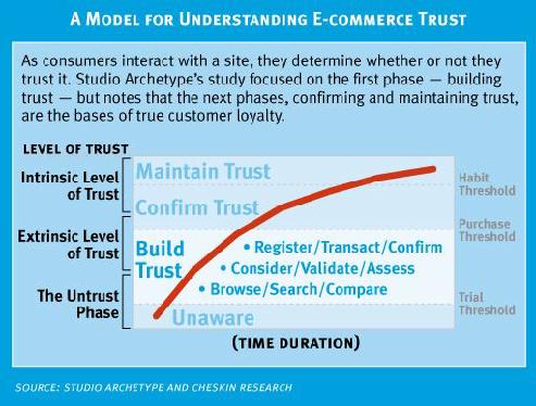 Trust has the following dimensions: security, reliability, confidentiality. Transactions must be processed without fear of network attacks. Both buyers and sellers need to be able to count on consistent service. The information should be presented in accessible, easy to navigate format. Companies must be sure that any transaction information will be maintained between the trading firms.