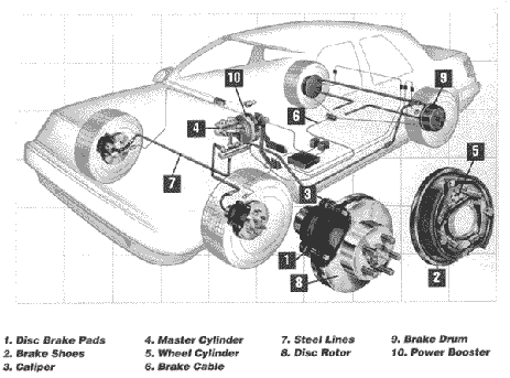 Your vehicle's brake system uses a master cylinder, calipers or wheel cylinders and a network of hoses and steel lines to hold the system's life blood - brake fluid - under pressure. It is this fluid pressure that makes modern braking systems so safe and reliable. When you step on the brake pedal, the master cylinder transmits the force from your foot pressure to the brake fluid in the hoses and lines. In turn, the pressurized brake fluid pushes the wheel cylinders on drum brakes or calipers on disc brakes. This movement of fluid causes the internal parts of the wheel cylinder or caliper to move outward, pushing the brake shoes or disc pads against the brake drum or rotor. The contact between these parts causes friction (heat), which brings your car to a controlled stop.