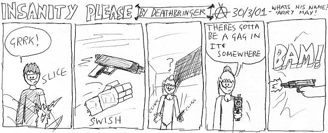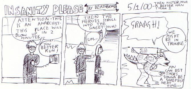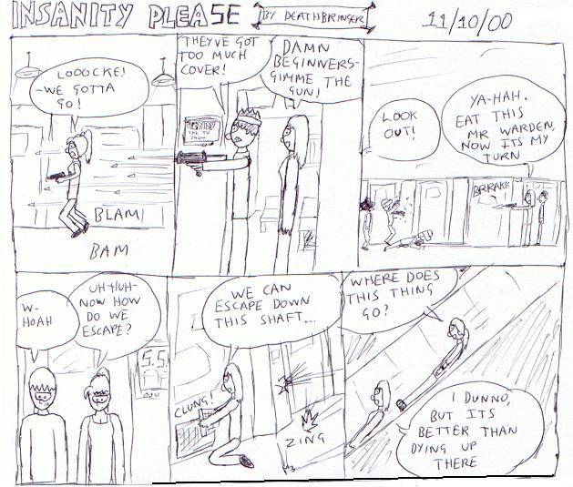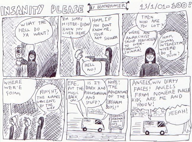 It wasnt until 2000 that insanity please was brought to a bigger audience,as an online comic strip! (and a few dodgy gifs),Gone was the south park refrences and instead it was now more of a cross between FF6,FF7 with some punk and a lot of violence,the shinra being more like 'the party' from 1984