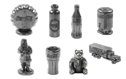 Game Board: Property Cards - Play Money and Banker's Tray - 2 Dice - 8 Collectible Pewter Tokens: contour bottle, fountain dispenser, genuine glass, bottle cap, delivery vehicle, Hutchinson bottle, Polar Bear, and the Coca-Cola Santa - Santa Cards - Polar Bear Cards - 32 Six-Packs - 12 Vending Machines