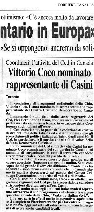 Il conduttore di programmi radiofonici della Chin, Vittorio Coco, è stato nominato la scorsa settimana rappresentante del Centro Cristiano Democratico in Canada. L’annuncio è stato fatto dallo stesso segretario del Ccd, Pier Ferdinando Casini, dopo un incontro avuto col professionista canadese a Roma, in occasione della Conferenza sugli italiani all’estero. Il Ccd, come è noto, fa parte della coalizione di centrodestra del Polo delle Libertà ed è stato fondato dopo gli sconvolgimenti politici italiani all’inizio degli anni 90. Il Ccd, in particolare, è il partito che si rifà ai valori della defunta Democrazia Cristiana. In un comunicato del Ccd si precisa che Casini ha nominato Coco commissario del suo partito in Canada col mandato di «organizzare in tutto il territorio canadese circoli provinciali e locali del partito della vela». Coco ha detto di essere onorato dalla nomina ma di «avere accettato l’impegno con grande umiltà. Sono consapevole del grande lavoro che abbiamo di fronte ma ha aggiunto sono fermamente convinto che in Canada siamo in molti a riconoscerci nel partito del Centro Cristiano Democratico, un partito di valori e di ideali». Con la nomina a commissario, Coco è in effetti il segretario regionale del Ccd per la circoscrizione canadese e risponderà direttamente all’on. Casini. Coco è molto noto negli ambienti italocanadesi soprattuto attraverso il suo programma radiofonico trasmesso quotidianamente dalla Chin, "Wake up Italian Style". Il lavoro sarà in effetti molto impegnativo soprattutto se si completerà l’iter burocratico per far entrare in vigore la nuova legge sul voto all’estero e quindi con la necessità di avere anche candidati locali.