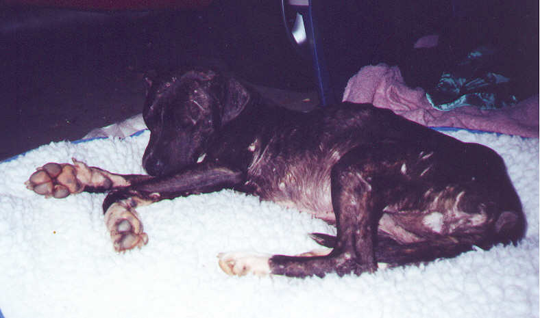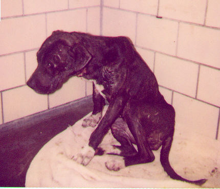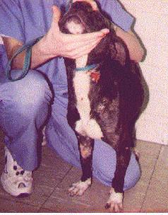 There he found the pitiful ten month old pup, covered with open sores and