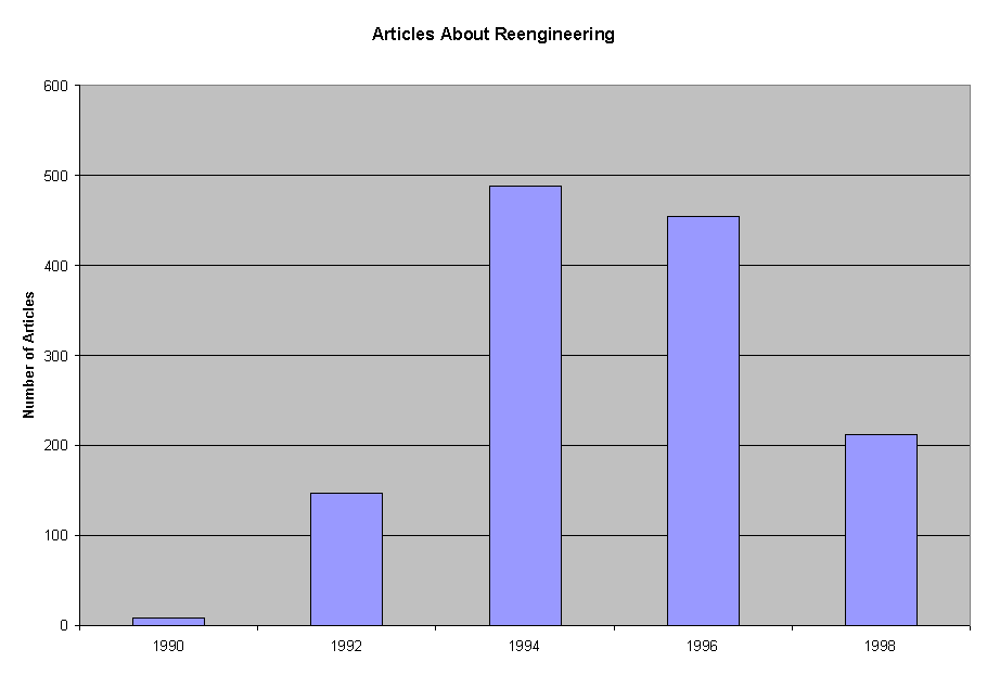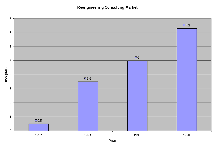 From Concept to Product Michael Hammer introduced the business world to reengineering with the 1990 article "Reengineering Work: Don't Automate, Obliterate," in the July/August edition of the Harvard Business Review. The article presented a description of reengineering and a case study of several companies that, in Hammers view, had successfully reengineered. In explaining the essence of reengineering, Hammer said, At the heart of reengineering is the notion of discontinuous thinking -- of recognizing and breaking away from the outdated rules and fundamental assumptions that underlie operations. Unless we change these rules, we are merely rearranging the deck chairs on the Titanic. The ideas put forth in the article, were not new, but they hit a nerve with the business community. The number of articles written on the subject of "reengineering" grew from 8 in 1990 (only 1 related to business reengineering), to 147 in 1992 (121 about business reengineering) and mushroomed to 489 in 1994. The market was ripe for reengineering, and Hammer and CSC Index exploited it. While developing a strategy department based on reengineering, Champy and Hammer began collaborating on the book that would eventually make reengineering a household word. Reengineering the Corporation: A Manifesto for Business Revolution, was published in 1993 and spent 6 months on the New York Times best-seller list. By June 1995, it had become the number two management bestseller of all time behind In Search of Excellence by former McKinsey & Co. consultants Tom Peters and Robert Waterman. By 1997 it had sold over two million copies, was published in seventeen languages and had achieved five digit sales figures in Europe. The Japanese version sold 250,000 copies in the first three months. As the books popularity grew, so did the prestige of CSC Index and Michael Hammer. Riding the wave of reengineering, CSC Indexs revenues grew from $28 million in 1988, to $70 million in 1992. Having "invented" the concept, CSC retained control of the market for reengineering consulting services at first. A 1991 article on the subject stated: Say business reengineering and an increasing number of IS managers will reply, Index Group. Unlike their counterparts at other consulting firms, many of whom are scrambling to gain expertise in the area, Indexers have been writing and speaking on the topic -- not to mention working with clients who are reengineering business processes -- for the better part of a year. By 1994, CSC Indexs revenues had topped $160 million. Michael Hammer had also profited from the explosive growth of reengineering. By 1994, he routinely filled training seminars with hundreds of executives eager to pay the $2,000 fee to hear him speak. Hammer functioned as the radical evangelist and cheerleader for the reengineering cause, peppering interviews and lectures with quotes like "folks, were going on a journey. On this journey well carry our wounded and shoot the dissenters." He compared reengineering to a neutron bomb: "The walls remain standing, but everything else is nuked." Hammer was also keenly interested in promoting himself. In reference to the book he co-authored with Champy, he noted, "[It] is by Hammer and Champy rather than Champy and Hammer." Champy accepted Hammers self-promotion as long as CSC Index got its share of the credit. "Im okay with Mike establishing a guru position. It isnt as personally important to me to have my name here, although it is very important to me to have my firms work represented." Champy was primarily interested in using reengineering to generate growth for his firm. He made the following comment: We believe that everybody must reengineer - and they should do it in the next two to three years. And we believe that companies that dont reengineer will not survive - at least not in their present form. They might be acquired, or they might be one-tenth the size they are today. But they wont be strong players unless they reengineer. For companies to reengineer in the timeframe Champy suggested, they would almost certainly need to hire a consulting firm like CSC Index. Champy advocated a "kinder, gentler" reengineering than his co-author, explaining that while change was required for survival, it did not have to be as threatening as the change advocated by Hammer. "You dont need to toss out middle management, just restructure its roles." The concepts rapid rise in popularity can be attributed, at least in part, to its name. Hammer said of reengineering: Its a very American term, and it doesnt sound too abstruse or academic, so people like to use it. American companies dont want to be rescued by a concept like TQM, which, came to these shores wrapped in Japanese culture and terminology Give us apple pie, MIT and reengineering any day. CSC Index and Michael Hammer had tapped into the hottest management fad in decades. With the breadth and scope of change that reengineering required, it seemed that reengineering projects would last for many years, far eclipsing TQMs effect on business. The success seemed to feed itself. Managers would repackage their initiatives as reengineering and sell it to bosses, shareholders and employees. Consultants could bill up to $1 million per month on long-term reengineering projects. The only people not happy about the process were rank-and-file employees and middle managers. As senior executives experienced pressure from shareholders to show returns from expensive reengineering projects, they found that one of the fastest ways to recoup their investments was to reduce head count.