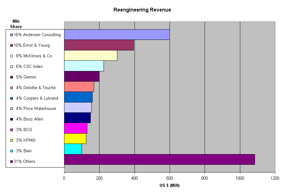 Clouds on the Horizon By the end of 1994, the board of directors at CSC had some concerns about the future of reengineering. The topic was still popular, but interest in the business press had peaked. In addition, the successes of CSC Index had not been overlooked by their competitors. Big Six accounting firms such as Arthur Andersen and Deloitte & Touche recruited industry experts, MBAs and even recent college graduates at record rates in order to expand their consulting units. Ernst & Young established a Center for Information Technology in Boston, with a former CSC consultant on staff, gaining 10% of the market. Though leading the charge into reengineering, CSC Index fell to fourth place with an estimated 6% share of the market; reengineering projects accounted for nearly 100% of its revenues. (Exhibit B) In addition, many large corporations were beginning to allocate more money to enterprise systems software, such as SAP, Baan and PeopleSoft. Some of the polish seemed to be wearing off the reengineering concept. Although originally intended to produce broad restructuring of companies from the ground up, reengineering had instead come to mean layoffs. In fact, a June, 1994 poll of 621 companies conducted by CSC Index found that many confused the term reengineering with downsizing. Champy himself estimated that 60-70% of all reengineering projects ended in failure. There were also troubles on the home front. In July, 1994, Hammer and Champy announced that they were going their separate ways. Essentially, the split boiled down to a disagreement over "how violent" reengineering should be. Said Hammer, I think our paths parted because we had different agendas. Jim is chairman of a large consulting firm, and he has certain concerns about reengineering. I have a small education firm. I feel my job is to teach companies how to succeed at reengineering." Champy replied, "Its just that Ive moved some in what I believe you need to do when you reengineer. Ive just gone in a different direction." Sitting in his office, James Champy reflected on what his next moves should be to insure the continued growth and success of CSC.