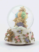 Up, up and away on their beautiful balloon are these fun-loving teddies in a swirling musical water globe. A charming and colorful alabastrite base adds a floral accent. 5" diameter, 5 3/4" high. Tune: ÒUp, Up And Away.Ó $24.95