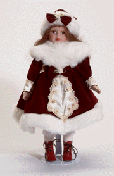 "Claudia." A sight to warm the heart on the chilliest of evenings! A beautiful burgundy velveteen dress with white fur trim. 16" tall. $29.95