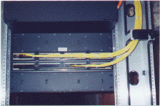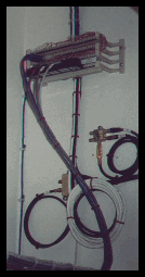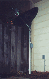 The equipment/cabling on the bottom left was all mounted on a wall in a closet approximately 20 inches in width. Included are telephone and cable TV lines coming in from the outside. From here 1 coax cable and one CAT5 cable are distributed to each room in the house. This configuration allows a person to access a Local Area Network, Cable TV and 2 analog phone lines from any room they choose. This closet can still be used for it's original purposes. As you can see, not much space is needed The bottom right photo is a DirecPC / TV satellite dish. Notice that no cable is exposed off of the dish. Underground conduit and electrical boxes were used to conceal and protect the cable.
