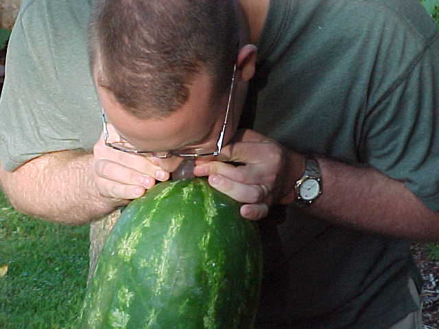 We don't know what Brian is doing to the melon here, but it looks serious.