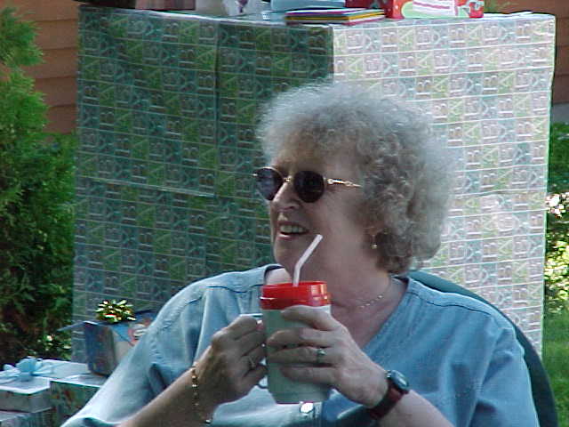 In answering Lou's remark, Donna kindly hides her middle digit behind the drink.