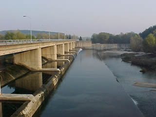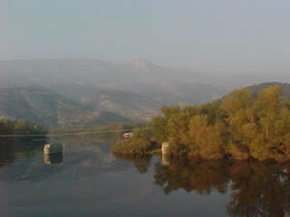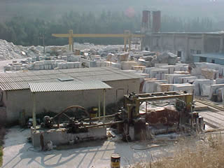 | A quarry busily slicing marble to supply the huge demand for it here. | A picturesque dam on the River Nestos near Kavala. |