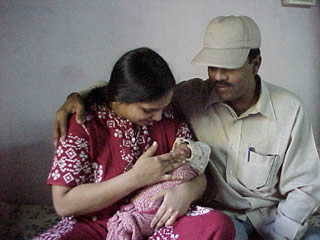 | The farmworkers on Umesh's farm proudly displaying their bullocks. | Manoj, wife, and 9 day old daughter, wrapped up like a burrito. |