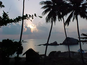 I'm currently on the island of Ko Tao, just off the east coast of Thailand, where for the past week I've been trying to drown any little currents of homesickness in a sea (no pun intended) of good food, sunshine, snorkeling, and sloth. So far I've been pretty damn successful. As far as any homesickness goes, though I've been on the road for 5 long months I think its the 3 ahead of me that will be the harder. For those of you who actually felt a pang of pity for me just then, I invite you to take a look at the pics attached to this mail to see if you still feel the same way. Any abuse you then feel for me can be hurled to the following address: [email protected] The island is about 5km by 8km, hilly as hell, and covered in lush green foliage. I've been told that there are no poisonous snakes here, but that doesn't stop me from hoping. Pythons on the other hand... Any suggestions on how to get an exotic pet snake through US customs? And, no, I don't think swallowing it would be the best way, though it might be an ironic twist on a bad horror movie. Getting about on the primitive roads here requires a dirt motorcycle and national-level handling skills, but again, that doesn't stop me from doing it on my bike. (It also doesn't stop the locals from renting the m/c's out to us dumb falangs (foreigners) for $4 a day. They make their money not from the rentals, but from the prices they charge for replacement broken parts! Quite a different operating philosophy from their US counterparts...) I take my bike up and down every path they do, though usually with it on my shoulder - the trails, at least the steepest portions, consist of hardpack covered in pea gravel. This makes just walking a challenging proposition, let alone riding. The fastest way I've found is walk 2 feet, slide on your ass for 4, though I'm rapidly running out of peroxide, as a result. It does make for an interesting line to use on the beach, however: "Excuse me, could you rub some lotion on my...." I haven't gone down on my bike yet, but anticipate (though not excitedly, for some strange reason) doing so soon. In fact I'm gonna increase the odds a bit tonight and go get sloshed at a bar on the other side of the island before trying to ride my way back in the dark. If only the bar was a little closer... I realize that I TRIED to pick the most remote spot on the island to stay, but I was hoping it would have at least ONE night a week when people hit the bar en masse. I guess when the resident population of the beach totals 12 folks, the bar doesn't get so wild at night. Hence me being on the other side of the island for a change. But I hear the helicopter ride to the nearest hospital is wild! If I could take my digital cam underwater to let you see what I see THERE, I would do it today. This place is amazing, even though you can see evidence all around of its been abused by the hand of man, whether intentionally or through simple tourism pressure and accidental mistakes. So many fish, so much coral, all the colors and activity. Though I've been diving once, I've seen the most and best stuff just snorkeling. Yesterday I took a cruise out to a little bay known for its shark presence in the afternoon (feeding time - how appropriate). After 20 minutes of drifting in 30 feet of water (10 minutes of that time was spent looking backwards nervously), I finally saw the first one materialize silently out of the gloom, as they always seem to do underwater, even though I'd kept straining my ears to hear the familiar da-dah! da-dah! musical notes that I just KNEW would accompany them. Ghostly and about 2-3 feet long, though the water magnifies them until they look, oh, about 11 ft at least, it totally ignored me. At least until I tried to swim in for a closer look. Then it suddenly turned on me, and in a flash of white teeth and swirling fins...aaahh!!! Naah, the sob's never would let me get close to them, though I saw, and chased, about 10 or 12 over the course of half an hour. These were little reef sharks, though you can occasionally see hammerheads there I hear. I did get much closer to the school of 20-30 barracuda later in the day, swimming about 3 feet over the top of them at one point. Someone once told me that they could be dangerous also, so I hid the bag of bloody meat I was carrying to attract the sharks behind my back, out of their sight. No problem. While staying here, I (the Brit from America) met and have been hanging out with Marc (the Brit from Belgium), Rhian (the Brit from Hongkong), and Shay (the Brit from Ireland) and having a great time, though it did take me a while to get on top of Shay's STRONG Irish accent. Needless to say, I can now understand the frustration people have with having to say "What?" every time I speak too softly. And let no-one ever say that I'm too choosy about the company I keep - I'll hang out with Brits from ANYWHERE in the world. Though they all had their own interesting life-stories to tell, I've gotta admit Shay takes the cake. Anyone who runs off to join the French Foreign Legion at 16, but has the presence of mind to not take his passport with him so he can desert 3 months later with no hassles, is alright in my book. He says he can't return to France now, as a result - sounds like a small price to pay! Needless to say, these guys figure heavily in my reluctance to move on from here. The weather is nonstop sunny though a 5 minute morning rainstorm today was quite welcome. I should have a picture by now to show off the tan, but I've been remiss in picture taking. I promise good ones soon. The food is excellent: fresh ingredients and tons of veg, cream of coconut soups, fresh seafood, lots of pasta. And my days are action packed: I spend hours planning ways to burn off all the calories by swimming, napping, reading, and sleeping. Today for instance, I spent 2 hours unlocking a coconut to get to the milk and meat inside (seriously - if you ever want to prevent a child getting into something dang