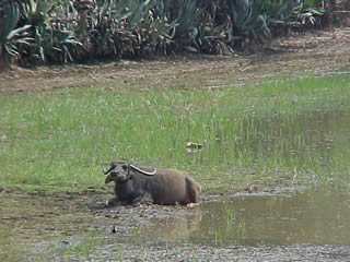 | The view from the bike when you stop and take out your digital camera to show folks - smiles soon erupt as they see their pics | A water buffalo, taking an enviable respite from the heat by living up to his name |